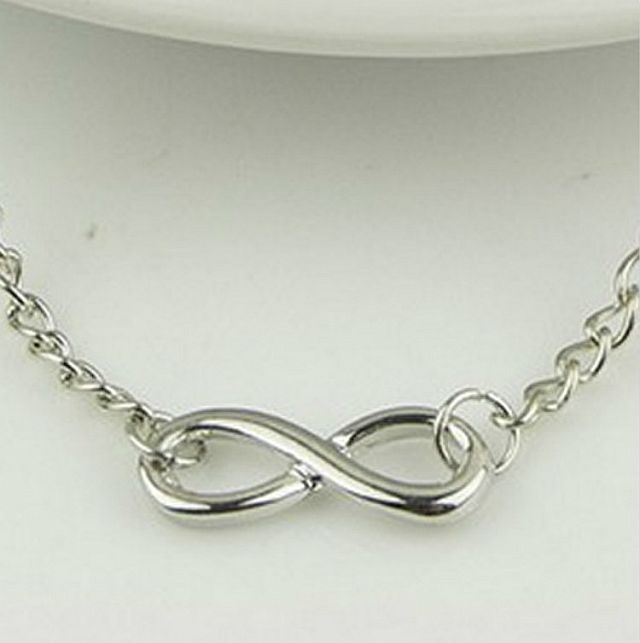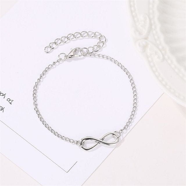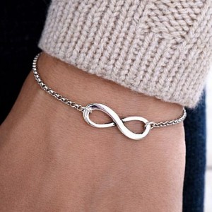 Bransoletka w kolorze srebrnym z ozdobą w kształcie znaku nieskończoności.