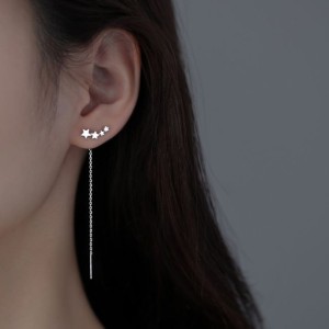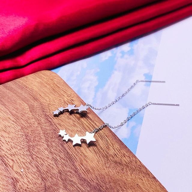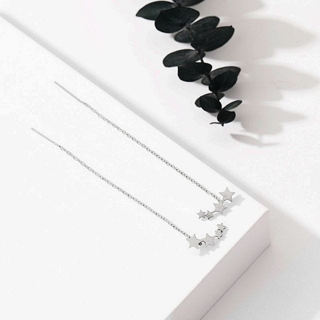 Kolczyki przeciągane przez ucho w srebrnym kolorze z czterema gwiazdkami na łańcuszku zakończonym pałeczką. Długość 7 cm.